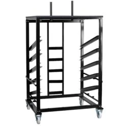 This convenient cocktail table dolly allows you to load all of your pedestal table pieces on one cart. The dolly features sloped shelves that will prevent them from sliding out of the dolly. The upholstered fabric platform top holds your bases and prevents the finish from being scratched. You can easily roll this cart on a truck to transport to different events.