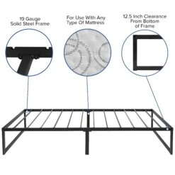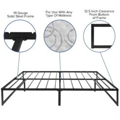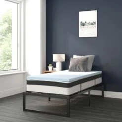 Bedroom furniture is an investment so durability is always at the top of the must have list. This bed frame foundation with included mattress and memory foam topper features a 14″ freestanding metal platform bed frame offering 12.5 inches of clearance for storage and ease of cleaning. Constructed from 19 gauge solid steel with reinforced metal screw construction this frame will hold up to 650 pounds. Solid steel slats hold the included 10″ foam and pocket spring mattress and 3″ memory foam topper without sagging and does not require a box spring. The lack of a headboard or footboard streamlines any sleep space and will lend vertical real estate to smaller bedrooms.