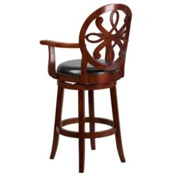 Flash 30” High Wood Barstool With Arms, Carved Back And LeatherSoft Swivel Seat