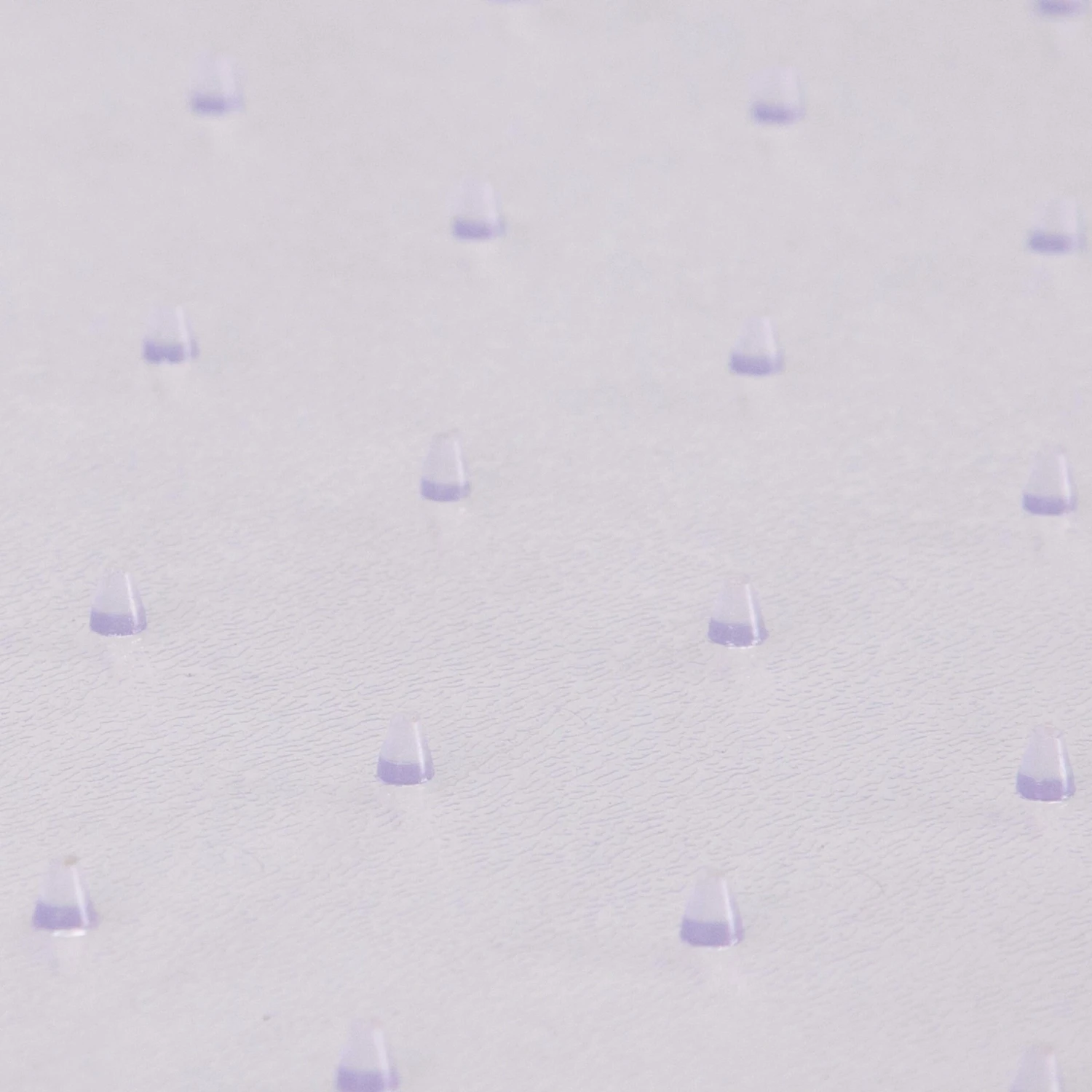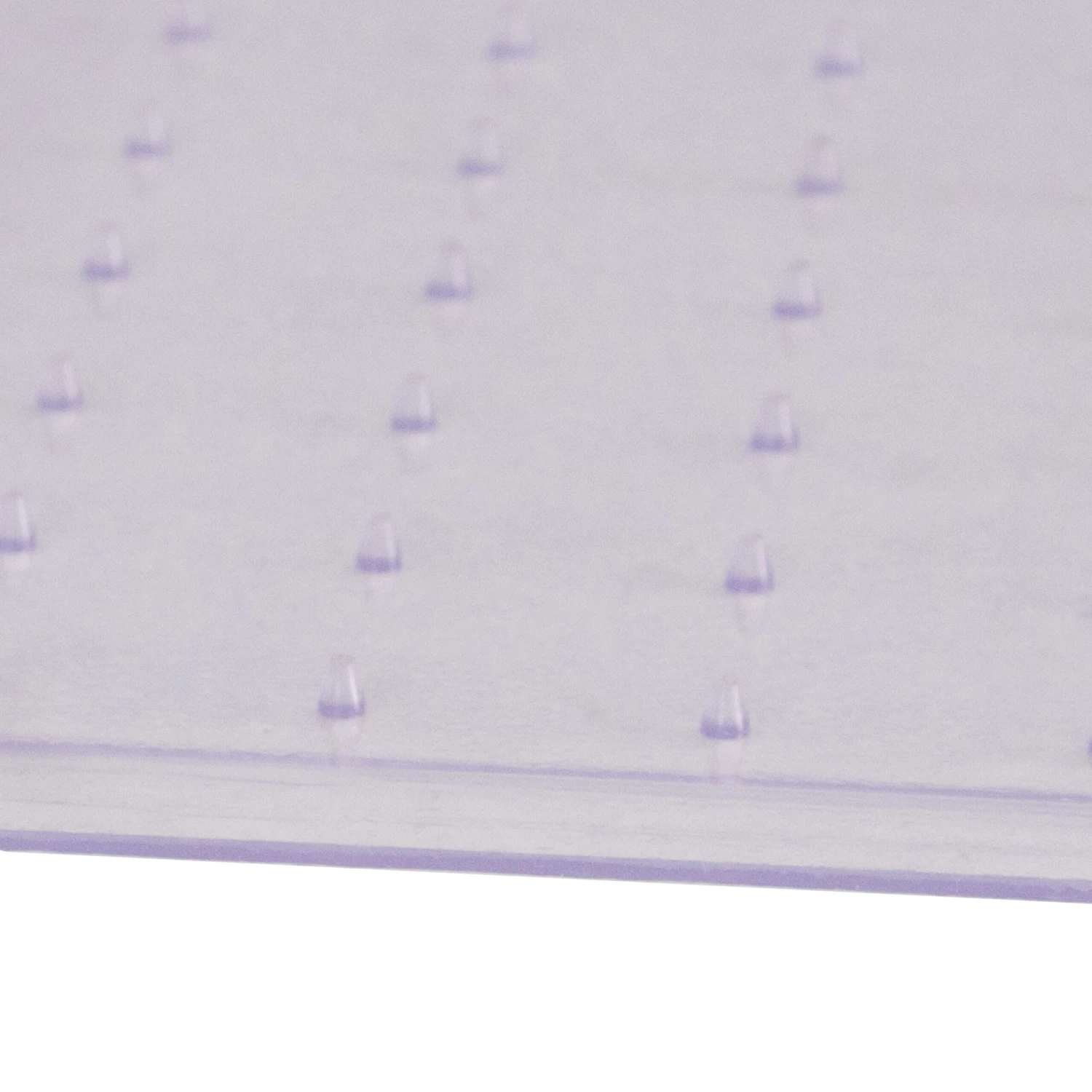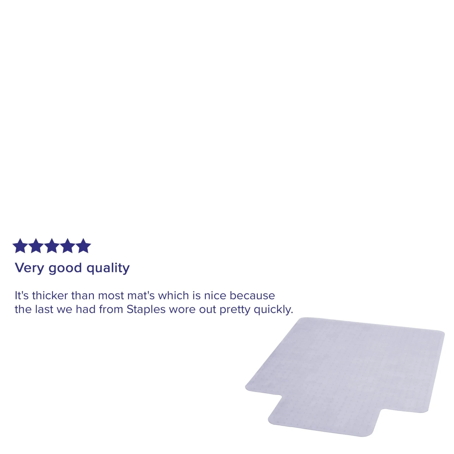 Move around easily in your carpeted workspace with this clear vinyl, commercial grade chair mat that will prevent carpet wear caused by chair casters. It features a scuff and slip resistant top surface for durability and safety. The underside has a gripper back to firmly anchor the chair mat on low pile carpet, protecting your carpet from spills and damage. The mat includes a protruding lip to protect the carpet under the desk and allow the chair to roll even when it’s all the way under the desk.