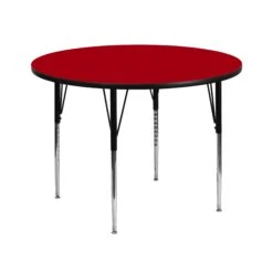 It features a 42″ thermal fused scratch, stain and warp resistant laminate top with a black edge band and 16 gauge tubular steel legs for increased stability. The top incorporates a protective underside backing sheet to prevent moisture absorption and warping. An attractive black powder coated finish protects the upper legs from scratches and height adjustable chrome lower legs give you the flexibility to raise or lower the table a full 9″ in 1″ increments. Self-leveling nylon floor glides keep the table from wobbling and protect your floor by sliding smoothly when you need to move it.