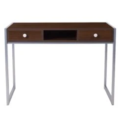Make your room pop with this Wood Grain Finish Desk with Metal Frame that has eye-catching white drawer pulls. You have three available sources for storage at your fingertips. Any items that you need quickly can be stored in the open center storage compartment. Keep important files and small items in the dedicated box drawers that glide with ease on ball-bearing glides. The powder coated frame adds a modern flair and contrast to the darker wood grain finish.