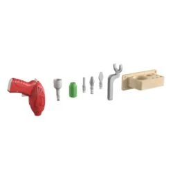 Simple engineering is made fun with this 8 piece tool and holder set. Pair with our 512 piece screw accessory pack and let kids explore their creative side while also improving their manual dexterity and fine and gross motor skills. The working drill is sure to be a favorite with it’s rotating bit and realistic sounds. The interchangeable tips fit both the screwdriver and drill for multifunctional use. Keeping the tools and accessories organized and close at hand is simple with the included holder that easily affixes to your STEAM wall panel with pegs or screws. Encourage collaborative play and teamwork when you give students a building project to complete together. The drill operates with 2 AA batteries (not included) for hours of fun. To clean, wipe with a damp cloth.