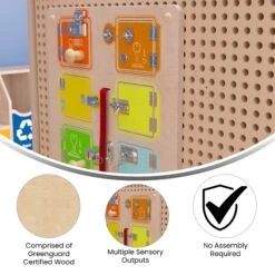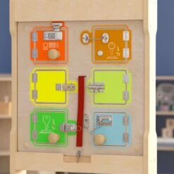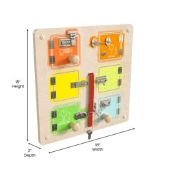Preschoolers can increase their manual dexterity, problem solving, and reasoning skills while having a great time with this wooden locks and buckles STEAM wall accessory board. Whether it’s sliding or flipping a lock or inserting a key, this interactive board can help little ones learn mechanical processes in a fun and exciting way. Put picture cards or photos behind the locked doors for an elevated game of matching or use the dry erase material behind each door to draw pictures or write special messages. This interactive busy board is brightly colored to capture and hold student’s attention and features kid-friendly, smoothly rounded corners for safe play. This Monetssori style busy board installs almost effortlessly on our train STEAM wall system, 3 panel wall system, or freestanding art easel but can be used on the floor or at an activity table as well. The tactile, visual, and sound output is great for sensory play and keeps kids entertained while teaching valuable life skills. Regularly wipe clean with a damp cloth and dry for long-lasting use.