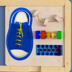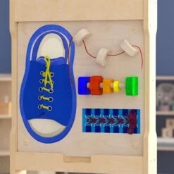 Preschoolers can increase their manual dexterity and problem solving skills while having a great time with this wooden turn it-tie it STEAM wall accessory board. Whether it’s the bunny ears method or simple classic knots, this lacing board can help little ones learn the mechanics of tying at their level instead of bent over a shoe. This interactive busy board is brightly colored to capture and hold attention and features kid-friendly, smoothly rounded corners for safe play. This Monetssori style busy board installs almost effortlessly on our train STEAM wall system, 3 panel wall system, or freestanding art easel but can be used on the floor or at an activity table as well. The tactile, visual, and sound output is great for sensory play and keeps kids entertained while teaching valuable life skills. Regularly wipe clean with a damp cloth and dry for long-lasting use.