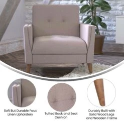 Clean lines and simple, but sophisticated, style make this commercial grade mid-century modern armchair a welcome addition in any home or business. Upholstered and boasting tufting on the back and seat cushions, this chair lends a chic, updated look that is sure to please.