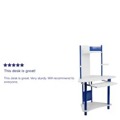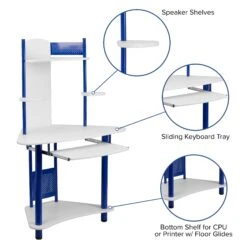 Add a cool, compact workstation to your kids bedroom and get organized with this tall computer desk with integrated hutch. This computer workstation provides a convenient workspace with a splash of color that will appeal to both kids and adults. Store all of your components within this computer desk, CPU, monitor and keyboard or laptop as well as a printer, and speakers. The pull-out keyboard platform can store your keyboard away when no longer needed. This desk provides a great option for studying or for casual computer usage. The corner desk with accents provides a small footprint that will not interfere in your walk space.