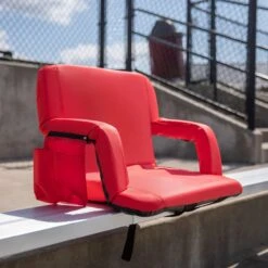 Whether you’re off to the big game, your favorite campsite, or a day at the beach you will always have a comfortable place to sit with this extra wide portable reclining stadium chair. Boasting 6 reclining positions, dual storage pockets, a thick cushion, and the ability to be used with or without armrests, this must have indoor/outdoor chair meets your every seating need. When you’re done for the day, simply lay the chair flat and use the adjustable backpack straps to free up your hands while you take the chair with you to the car, RV, or into the house. The slim profile makes vertical or horizontal storage a breeze.