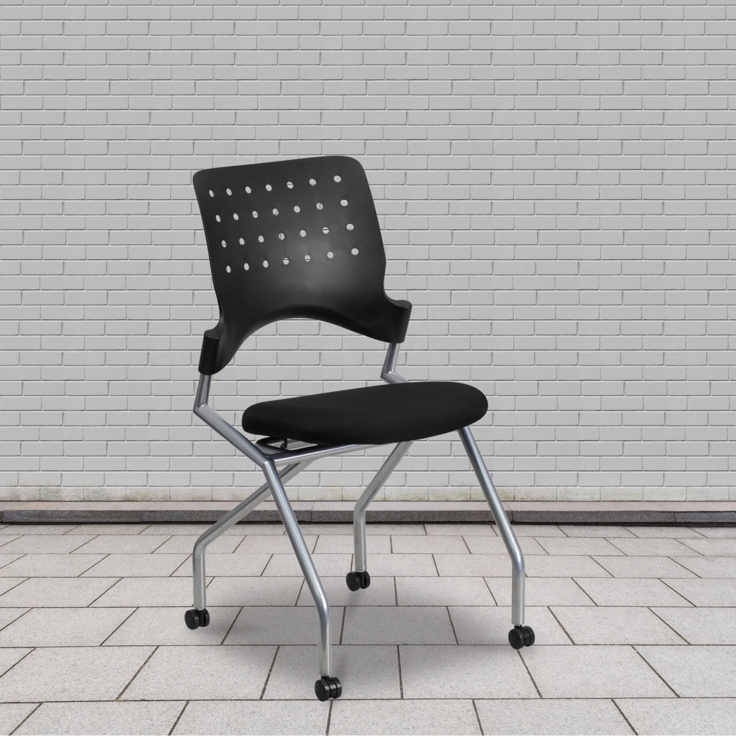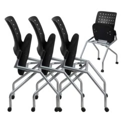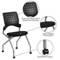 Get comfortable seating when you need it, additional floor space when you don’t. With an updated modern look nesting chairs are ideal for learning, training and collaborative environments. The simple yet stylish design is comfortable enough for conference rooms, reception and hospitality areas and visitor seating. The flexible, perforated back provides relaxation and enhanced circulation while rolling casters let you move and arrange chairs quickly. The curved back conforms to the user’s back for exceptional support. The contoured padded seat dissipates pressure points for greater comfort. Seats easily flip-up, then roll chairs to nest together.