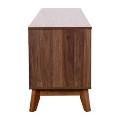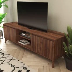 Refresh your decor and add much needed storage to your home with this mid-century modern TV stand that holds TV’s up to 64 inches and features a cord management port to keep your wires and cords in place. For an alternative design, mount your television on the wall above this entertainment center to open up more room for electronics or displaying family photos. Soft close doors on each end of the unit conceal open storage areas that let you hide unwanted clutter and provides storage for DVD’s, remote controls, or gaming systems.