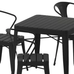 Modern style and materials combine to form this stunning all-weather, 5 piece patio set featuring 4 stackable patio chairs and a square table ideal for home or business use. The weather and rust resistant steel chair frames boast vertical slat backs and are paired with poly resin slats on the seats allowing for year-round use perfect for commercial outdoor dining areas as well as your backyard patio and stack up to 8 chairs high for storage. Underseat cross bracing makes these chairs capable of supporting up to 400 lbs. static weight capacity each. The matching table is also rust resistant, has cross bracing for sturdiness, and a poly resin slatted top that won’t rot, chip, or peel. All pieces boast fixed floor glide to prevent damage to indoor flooring surfaces. The set of 4 chairs arrives fully assembled while the table assembles in 10 minutes or less for quick setup. Cleanup is quick and easy with a damp cloth.