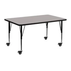 It features a 24″W x 48″L high pressure scratch, stain and warp resistant laminate top with a black edge band and 16 gauge tubular steel legs for increased stability. The top incorporates a protective underside backing sheet to prevent moisture absorption and warping. An attractive black powder coated finish protects the upper legs from scratches and height adjustable chrome lower legs give you the flexibility to raise or lower the table a full 9″ in 1″ increments. Casters allow you to easily move the table around and then lock into place.