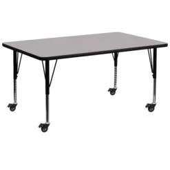 It features a 30″W x 72″L thermal fused scratch, stain and warp resistant laminate top with a black edge band and 16 gauge tubular steel legs for increased stability. The top incorporates a protective underside backing sheet to prevent moisture absorption and warping. An attractive black powder coated finish protects the upper legs from scratches and height adjustable chrome lower legs give you the flexibility to raise or lower the table a full 9″ in 1″ increments. Casters allow you to easily move the table around and then lock into place.