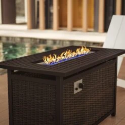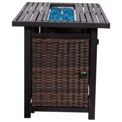 Extend your outdoor time when you gather around this patio fire pit table. Push summary ignition along with high and low settings produce up to 50,000 BTU’s to heat up to 36 square feet to keep you warm and toasty. This fire table is powered by a standard 20 lb. propane tank (not included) that will be tucked away and secured in the hideaway tank holder to keep your decorating aesthetic intact. The stainless steel table top will hold the included glass fire beads for a roaring fire but can become a table when the unit is not in use with the included lid and the wicker base looks great in any environment. Assembly takes less than 60 minutes and cleanup is quick and easy with a damp cloth. Adjustable floor glides provide a level surface so the fire burns evenly and the AAA battery for the igniter is included.