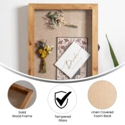 Keep old concert tickets, baby pictures, flowers from your first date and other memorabilia proudly displayed and free from dust or damage when you purchase this shadow box display case with included push pins. Fronted by a high clarity acrylic window and backed by a foam board with a beautiful linen overlay, your mementos will always look great.