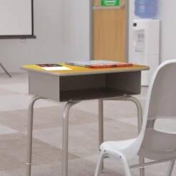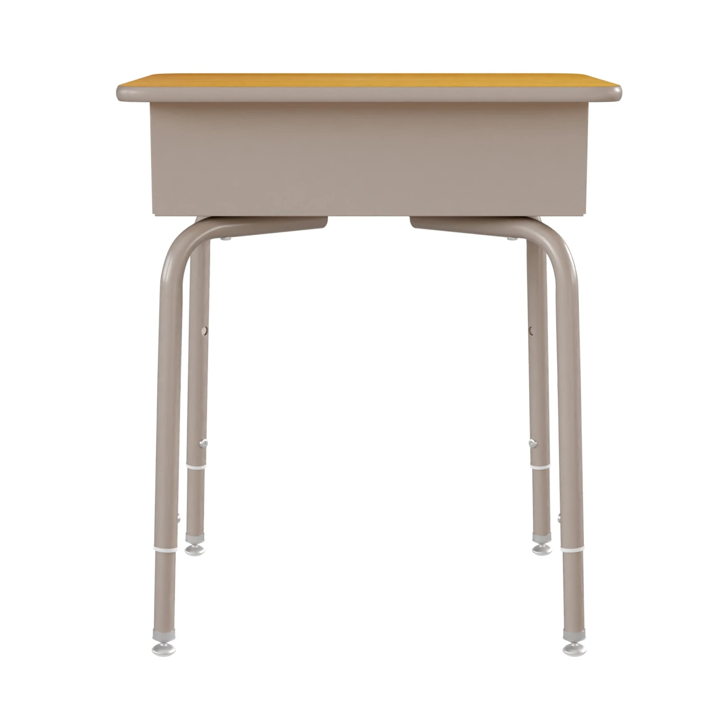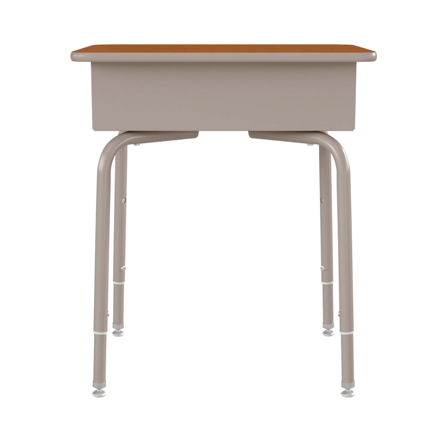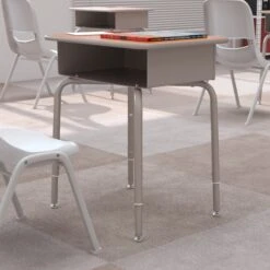 The high pressure laminate top is .625 inches thick with a black lacquer edge treatment for safety. Under the desktop is a spacious, heavy-duty, black metal book box with ample room for books, papers, and other supplies. The one-of-a-kind crisscross tubular frame ensures stability and the legs are height adjustable to fit students of all sizes. Adjustable nylon glides keep the desk from wobbling on uneven surfaces and protect your floors by sliding smoothly when you need to move them.