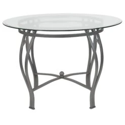Flash Syracuse 42” Round Glass Dining Table With Bowed Out Metal Frame